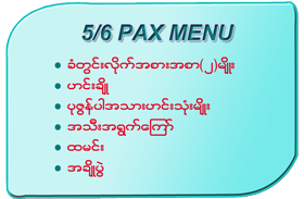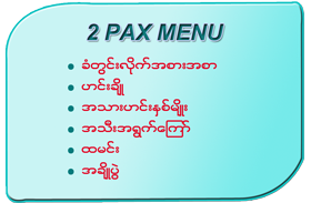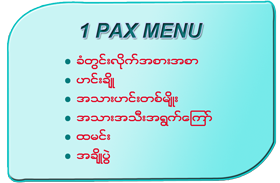 Tour Co.Ltd များအတွက် ခရီးသွားဧည့်သည်များနှင့် guide အပါအဝင်  နေ့လည်စာ၊ ညစာ package များဖြင့် သီးသန့် ၀န်ဆောင်မှုများ ထားရှိပေးပါသည်။ 10 pax နှင့် အထက် ဖြစ်လျှင် မြန်မာဟင်းလျာကိုလည်း တောင်းဆိုမှုှရှိပါက စီစဉ်ပေးပါသည်။
